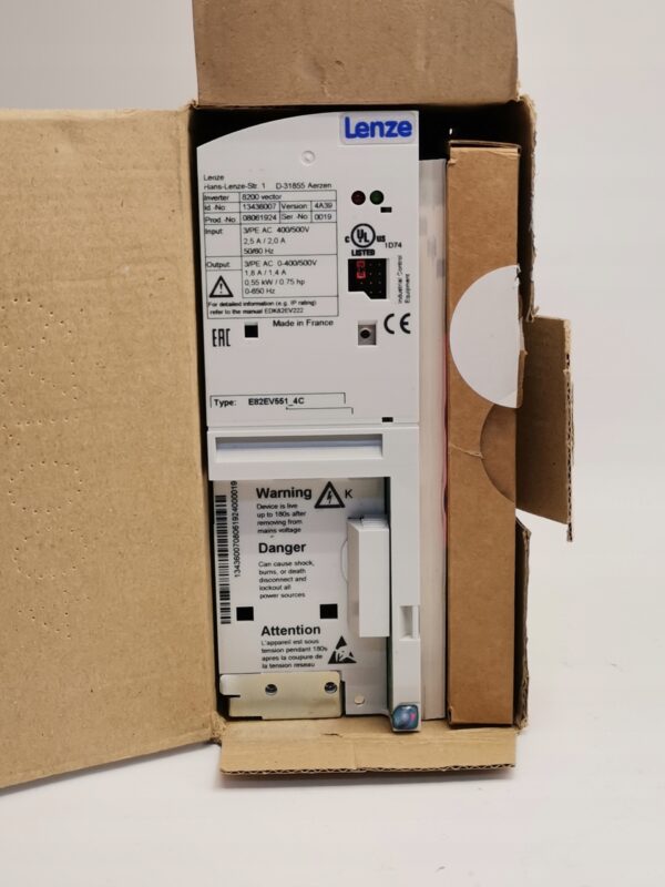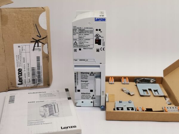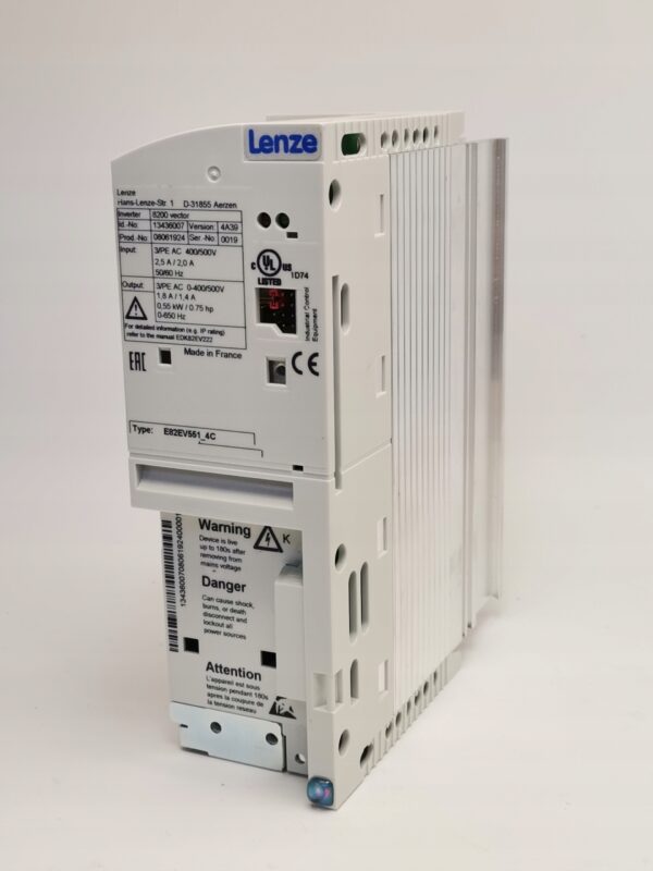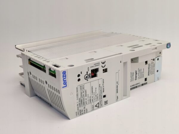 Falownik trójfazowy Lenze E82EV551_4C to przemiennik częstotliwości z serii 8200 Vector, przeznaczony do precyzyjnej regulacji prędkości obrotowej silników trójfazowych w aplikacjach przemysłowych.