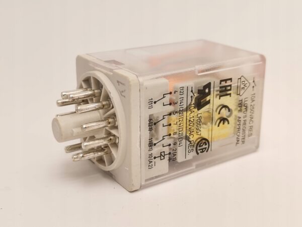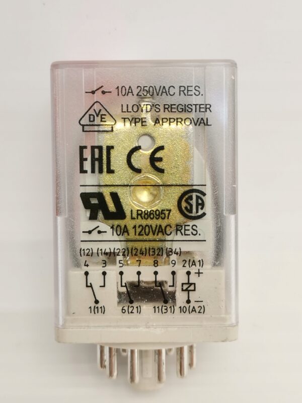 Przekaźnik elektromagnetyczny, przemysłowy – małogabarytowy, do gniazda wtykowego. Szerokość 35 mm. Wyjście: 3P – trzy zestyki przełączne – wyprowadzenia: 11(1),12(4), 14(3); 21(6), 22(5), 24(7); 31(11), 32(8), 34(9); AC1 – 10 A / 250 V; DC1 – 10 A / 24 V. Wejście / cewka – wyprowadzenia: (+)A1(2) – (-)A2(10), napięcie zasilania Un – 24 V DC. Wskaźnik zadziałania mechaniczny W, przycisk testujący T – z funkcją blokowania styków, wskaźnik LED czerwony L, dioda tłumiąca przepięcia D. Wymiary: 35 x 35 x 54,4 mm. IP 40. Materiał styków: AgNi. Do gniazd: PZ11, GZU 11, GZ11, GZP11, GOP11.