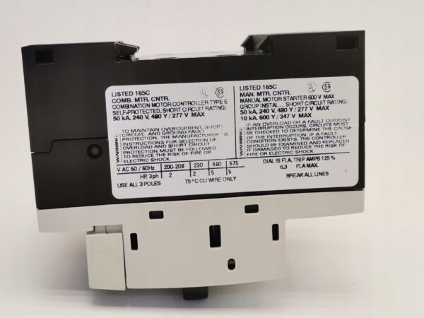 Wyłącznik silnikowy SIEMENS SIRIUS 3RV1011-1GA10 z zabezpieczeniem przeciążeniowym, termicznym o zakresie nastawy termicznej wyzwalania od 4,5 do 6,3A.